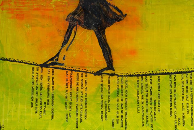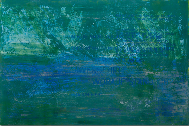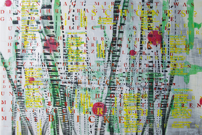 Die in den Gemälden verwobenen Literaturfetzen sind Elemente, deren Inhalt die Farb- und Formgebung der Gemälde bestimmen. Die Interpretationen der Gedichte, Aphorismen, Texte oder Bildfragmente aus Zeichnungen und Fotografien stammen alle aus der Sammlung der Künstlerin. Ihre Interpretation ist der Spielraum zwischen den Zeilen, der auch von den Betrachtern entdeckt werden soll.